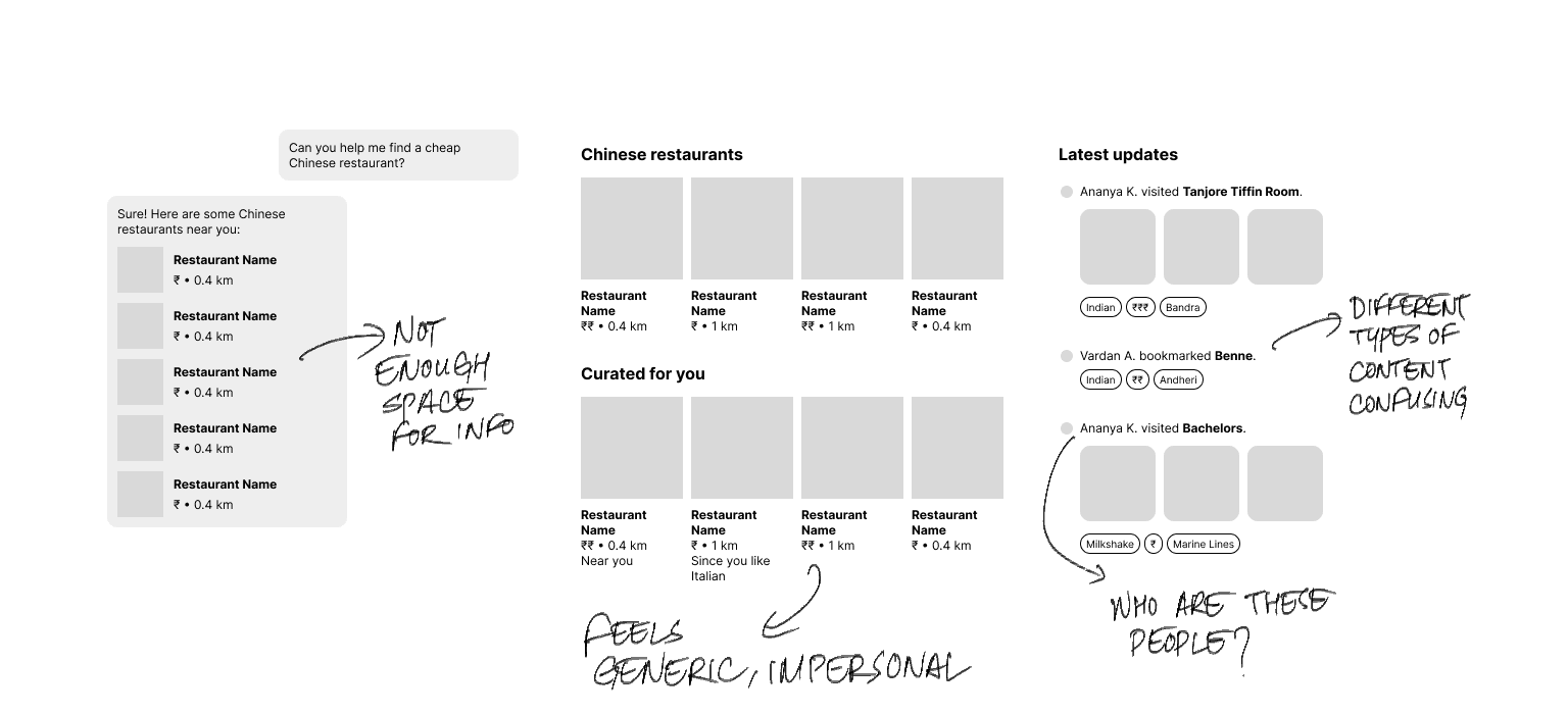 I explored several directions — conversational, feed-based, list-driven, hybrid — and rapidly tested them through low-fidelity prototypes to evaluate narrative fit.